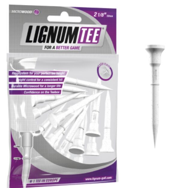 Lignum Tees van 53 mm. Op de tees staat 1 streepje om de hoogte van het opteeën te bepalen. Er zitten 15 tees in een zakje